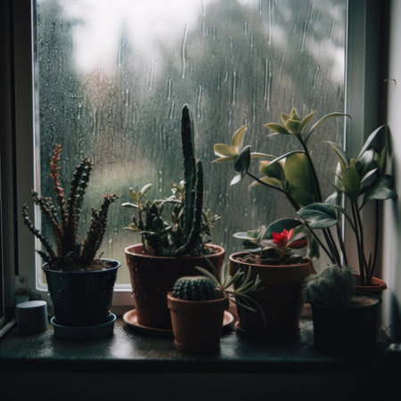 A window sill filled with potted plants on a rainy day. Generative AI image.