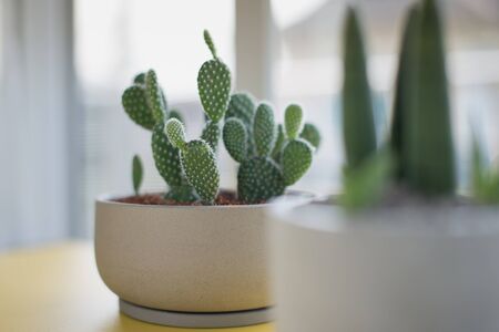 Opuntia or Bunny ears cactus in a gray ceramic pot, Opuntia microdasys (Lehm.) Lehm. Ex Pfeiff. Bunny-ear prickly pear