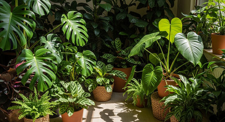 Grouping of potted tropical plants in natural light with soft shadows