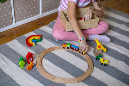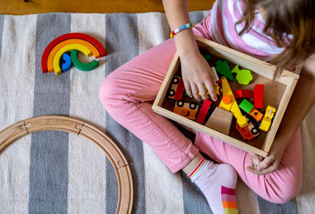 Child takes out wooden toys from the box. Railway toy. Montessori material. Home schooling concept. Eco friendly