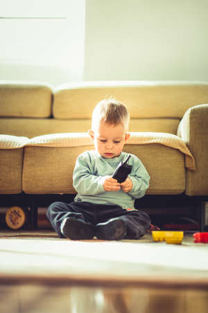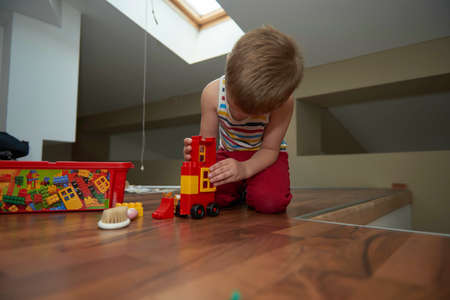 3 year old child is playing on floor at home. He designs and is totally focused on game