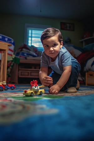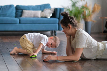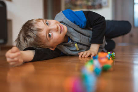 A cute little boy is playing on the floor with cars. The concept of children games, entertainment in quarantine, stay home.