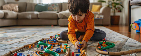 charming boy plays on the floor with car track. Child playing with toys indoor. Activities for kids at home. toddler activities. Kindergarten boy at home during quarantine. toned