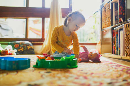 Adorable toddler girl playing with toys on the floor at home. Indoors activities for kids