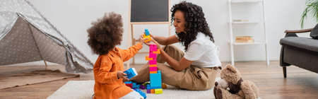 Smiling african american mother playing colorful building blocks near teepee at home, banner