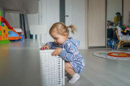 Adorable little girl in beautiful suit at home, near box with toys. Light and white interior.