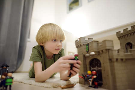 Little child is playing with toy prototype Medieval Castle. Knights and battles - favorite game for boys. Entertainment for kids indoors. Offline games.