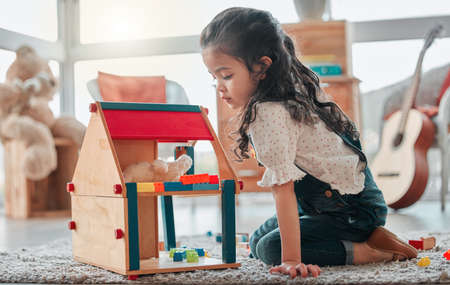 Screen time is not the only way to keep them entertained. an adorable little girl playing a dollhouse.