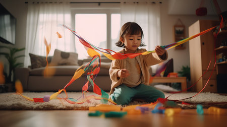 Male Caucasian child playing in playroom fun leggings. Generative AI AIG23.