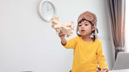 Asian little girl at home plays with a toy plane, she wants to become a pilot. Dreamer pilot.