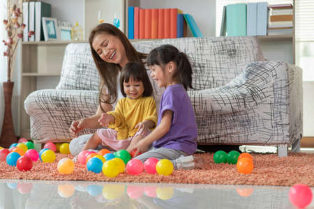 A mother and her two children play with colorful balls in their home, creating a scene of joy and laughter. The image captures the warmth and love of family life in a cozy setting.