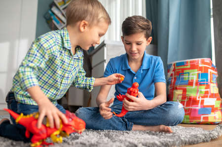 Adorable baby boy is sitting on the floor and playing with his older brother