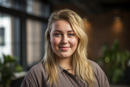 Cropped image of a smiling young businesswomen, looking at the front camera, with a blurred or bokeh background of modern office, AI generate.