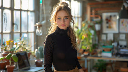 Young Woman With Blonde Hair Stands in a Bright Room With Plants