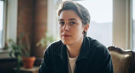 A woman with curly hair sits in a bright room. Light shines through a window, illuminating her face. The setting has neutral colors and a serene atmosphere that enhances her presence.
