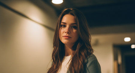 A young woman stands confidently in a sleek, modern corridor, showcasing her bold expression and stylish outfit, illuminated by bright overhead lights.