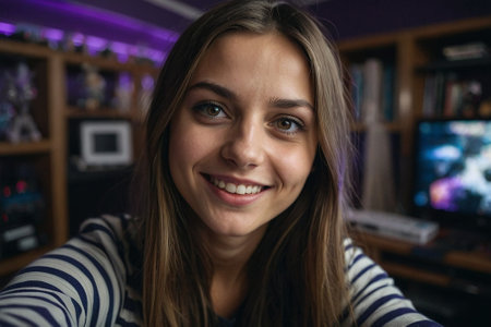 A young woman with blonde hair smiling warmly, wearing a striped shirt, soft lighting creating a cozy atmosphere