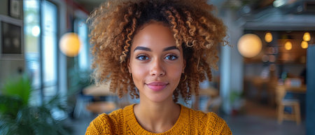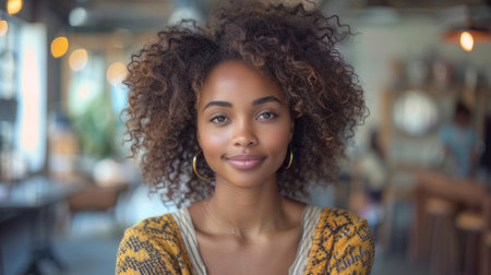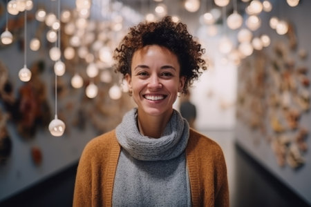Portrait of smiling african american woman with curly hair looking at camera in art gallery