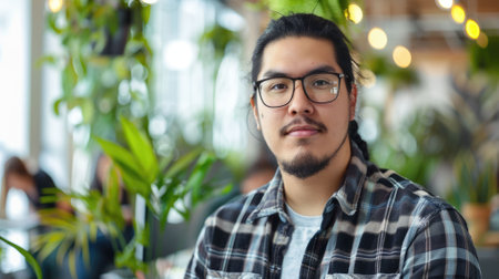 The picture of the native american male working as social media marketing inside office surrounded with trees, the social media marketing require skill like trend awareness, audience analysis. AIG43.