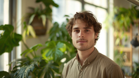 Portrait of handsome man looking at camera while standing in a greenhouse