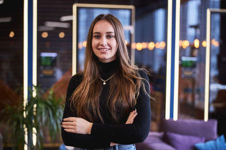 Portrait of a beautiful young woman smiling and looking at camera in a cafe