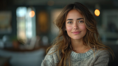 Portrait of a smiling young woman looking at the camera in the room