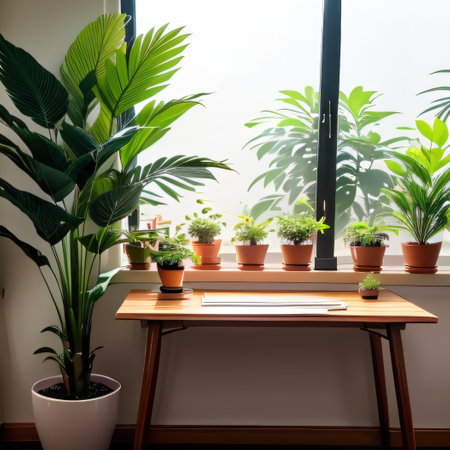 Brightly lit indoor space featuring a variety of greenery including tropical plants. A stylish wooden table complements the vibrant foliage and artwork on the walls, enhancing the serene ambiance.