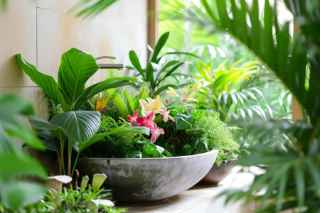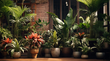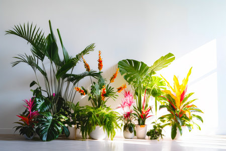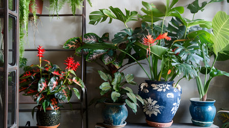 A lush and visually striking indoor garden scene featuring an assortment of potted tropical plants, vibrant flowers, and verdant foliage arranged in an attractive display. The scene captures the