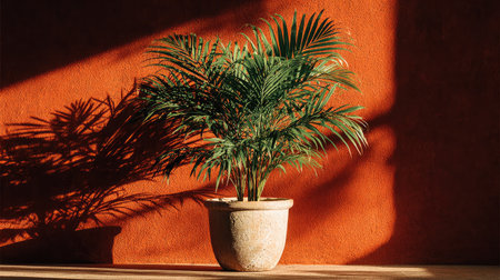 Photograph of a small potted palm plant in the style of studio photography, with hard shadows and sunlight shining from above, set against a dark background. The image features subtle orange and green accents, creating a minimalist aesthetic. --ar 16:9 --stylize 750 --v 7 Job ID: 6384b570-25e5-402e-8823-657d29a86445