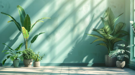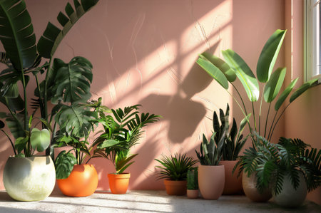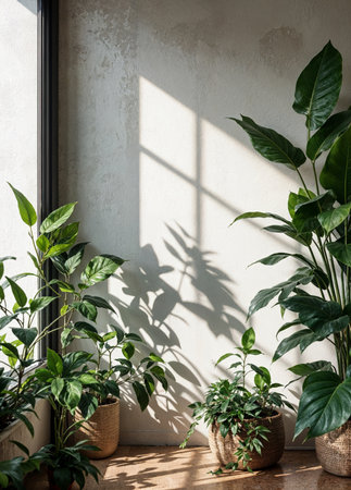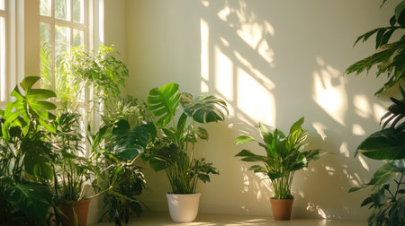 A tranquil indoor scene featuring a variety of lush plants basking in natural sunlight, casting beautiful shadows on a wall, creating a peaceful atmosphere.