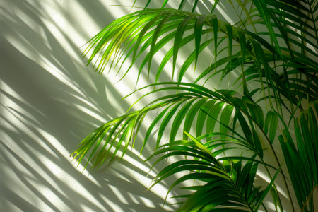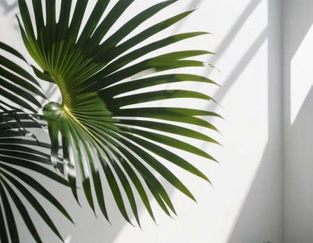 Tropical plant shadows cast on minimalist wall in strong sunlight