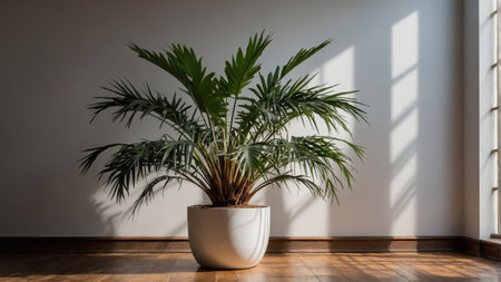 Madagascar palm tree standing in a white pot on a wooden floor near a window, casting shadows on the wall