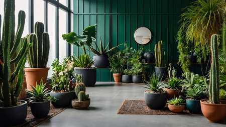 A cozy living room filled with various houseplants in terracotta pots, set against a dark green wall, creating a lush and inviting ambiance with a mix of different green hues and plant textures. AI generated image