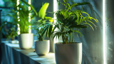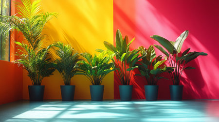 An arrangement of vibrant potted plants bathed in colorful lighting, creating a dynamic and lively indoor setting.