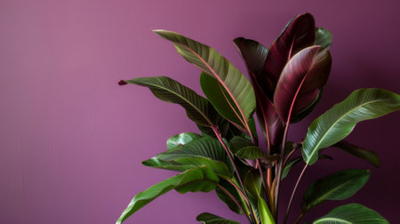 A towering plant with large tropicallooking leaves in shades of deep green and rich burgundy