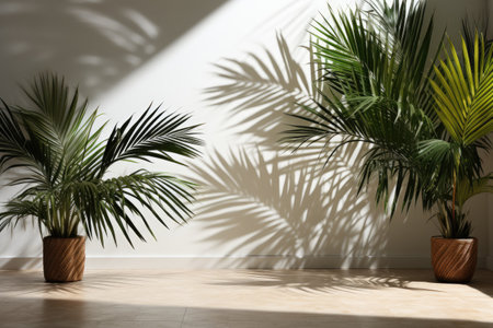 Empty room with shadows of window and flowers and palm leaves. Generative AI