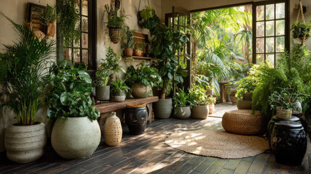 A serene indoor garden filled with a variety of potted plants and vibrant greenery, creating a peaceful and inviting atmosphere in a stylish home interior.