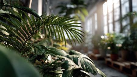 A serene indoor garden filled with lush greenery, showcasing vibrant leaves and gentle sunlight pouring through expansive windows, creating a tranquil atmosphere.