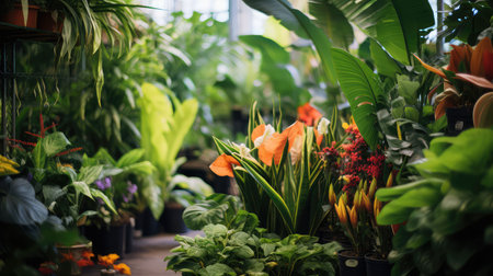 Vibrant indoor plant shop with colorful flowers and abundant greenery. That the image is generated using AI.