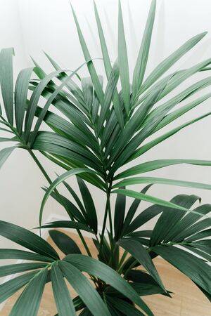 Palm leaves in pot on floor near white wall with shadows. Interior design