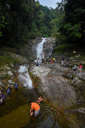 Lata Iskandar, Perak, Malaysia. March 25, 2018. A lady taking a rest at a Lata Iskandar waterfall, located along a trunk road from Tapah to Cameron Highland.