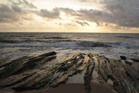 Beautiful sunrise over the beach in long exposure. Moving elements sunrise and wave photography from the rocky beach in india. Red sky in bay of bengal , slow-shutter Sea Waves and Rocks photography.