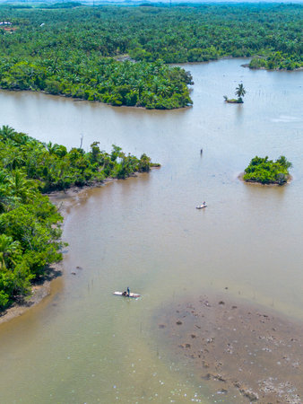 Town on the water and mangroves, top view. Coast of the island of Siargao. Tropical landscape.