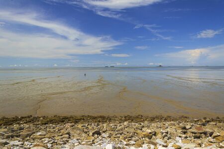 Beautiful stone beach in the morning with golden sunrise sky. Fisherman in long tail boat with folk fishing culture. Peaceful and tranquil scene. Calm sea in the morning. Seascape with skyline.