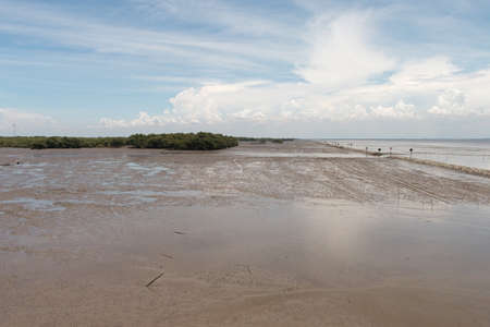 White egret standing on sand beach during ebb tide at at Laem Phak Bia against blue sky, Phetchaburi, Thailand