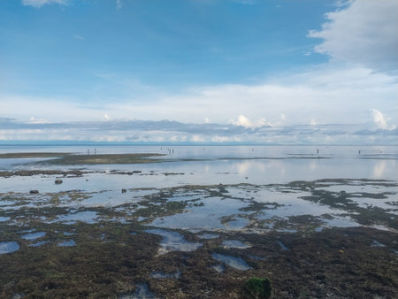 Sea landscape with clouds. Peaceful blue seascape. Tropical seaside minimal photo for wedding background. Peaceful cumulus on horizon. Tropical climate or weather change. Tropical sea island landscape