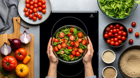 Modern table and electric stove with utensils and vegetables in the kitchen beside window : Generative AI