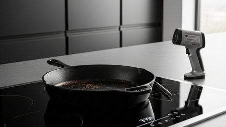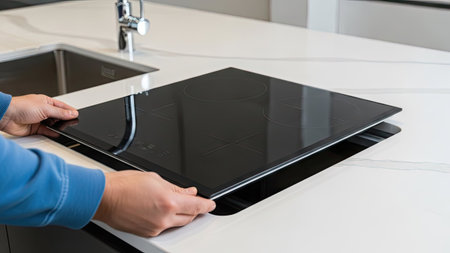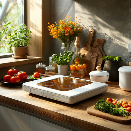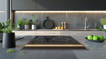 A high-end induction cooktop with clean lines and surrounding space on a kitchen counter, offering plenty of room for promotional or design use.