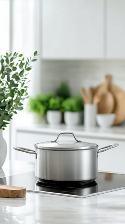 A stainless steel pot sits on a sleek kitchen stove, surrounded by green herbs and wooden cooking utensils. The contemporary kitchen features a neutral color palette and elegant decor.