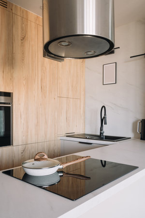 This contemporary kitchen showcases a frying pan with lid on stylish induction stove. Cooker hob built in a clean countertop against wooden cabinetry, highlighting a sophisticated space, vertical shot